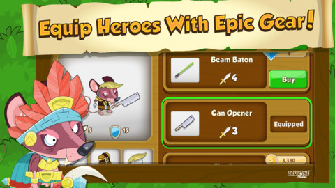 游戏中通过不断的‘开荒’会逐渐发现隐藏在密林中的‘兵营’,这些兵营就是生产老鼠战士的地方了。游戏中第一个解锁的兵营生产的是剑客,第二个是弓箭手,第三个是治疗法师,随着不断的开荒还能发现更多的士兵种类。既然说到士兵,就顺带说一下游戏的战斗,这里的战斗方式是即时类的,点击在开荒时遇到的蜥蜴、恐龙等怪物就会进入战斗界面,这里你可以控制小老鼠们自由行动和选择攻击对象,而且老鼠在累积几次攻击后还能发动绝技,总的来说战斗系统做的还不赖。